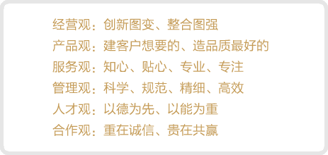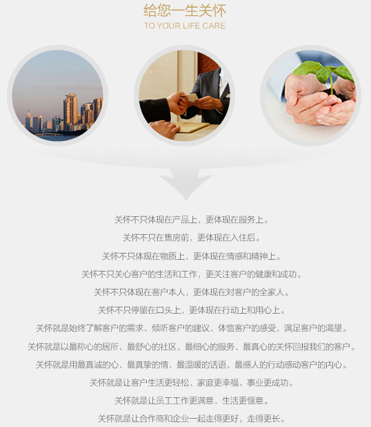 關(guān)懷:我們將以?xún)?yōu)良的產(chǎn)品和服務(wù)回饋客戶(hù)、以實(shí)現個(gè)人價(jià)值的發(fā)展平臺回報員工、以良好的利益共享前景回敬合作商、以奉獻傳世作品和創(chuàng )造城市價(jià)值回贈社會(huì )。