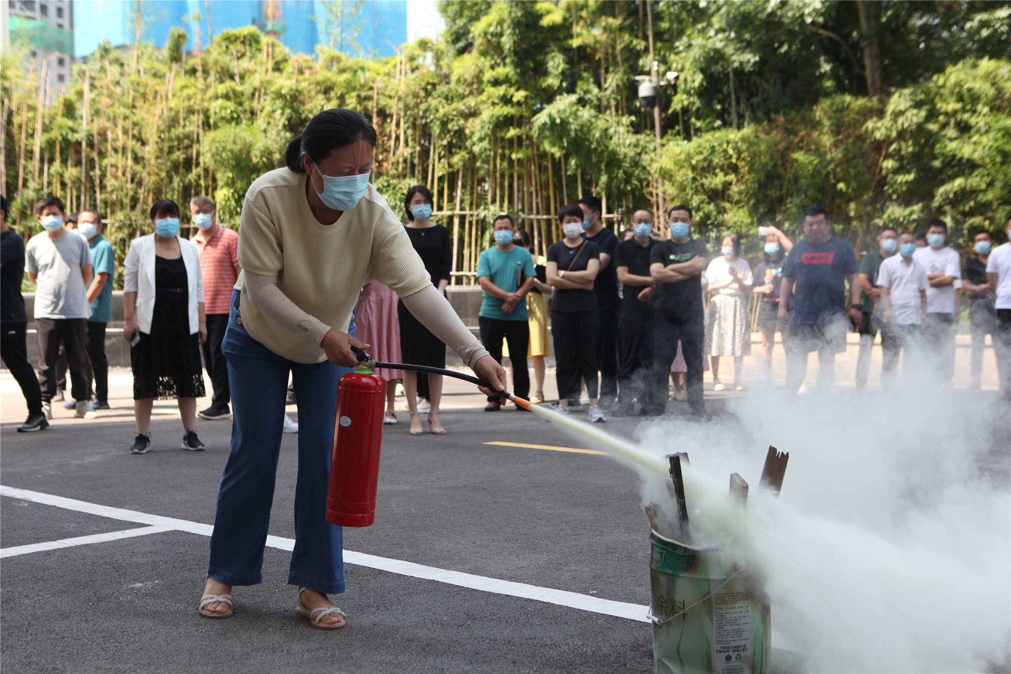 公司員工現場(chǎng)演練使用干粉滅火器滅火